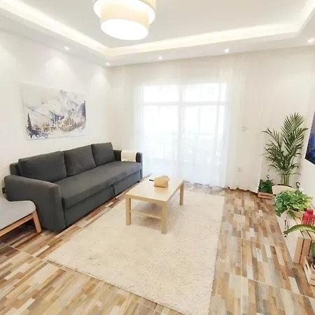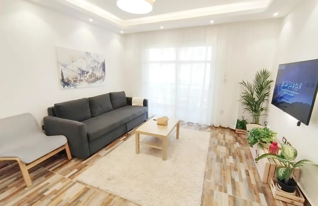 The spacious apartment includes a balcony, a living room, and a well-equipped kitchen with climate control and a washing machine for utmost comfort.